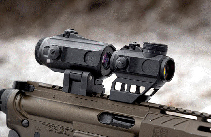 Magnifiers are typically mounted to flip-to-side bases so they can be flipped in or out of place on the fly. While they can extend the range of a red dot sight, they have a couple of drawbacks. First off, magnifiers have an eye box, while it’s usually a pretty generous one, this negates one of the major advantages of red dot sights—speed. Second, magnifiers have to be “zeroed” (mechanically centered to the sight picture of their counterpart optic) and they tend to shift out of alignment gradually under normal use, though red dot sights with magnifiers are still usable even with an offset alignment, this issue can prove annoying to those with OCD. Finally, magnifiers add weight (magnifying lenses being the heaviest part of any optic) and they occlude part of a shooter’s peripheral vision when not in-use. While the latter may not seem like much of an issue, bear in mind that red dot sights are typically mounted as far forward as possible specifically to preserve the shooter’s peripheral vision. Occlusion can be a major pain point when switching from one target to another or simply maintaining situational awareness. This issue can be alleviated with flip-to-center mounts, but these have the trade-off of occluding part of the red dot’s sight picture when not in use instead.